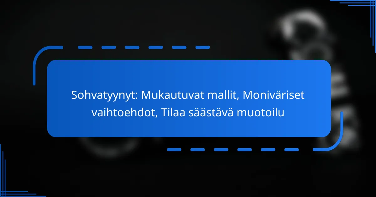 Monikäyttöiset sohvatyynyt tarjoavat joustavuutta ja käytännöllisyyttä. Esimerkiksi tyynyt, jotka voidaan muuttaa istuimiksi tai jalkatuiksi, ovat erinomaisia tilaa säästäviä vaihtoehtoja. Muunneltavat mallit, kuten tyynyt, joissa on irrotettavat päälliset, helpottavat puhdistusta ja vaihtelua.