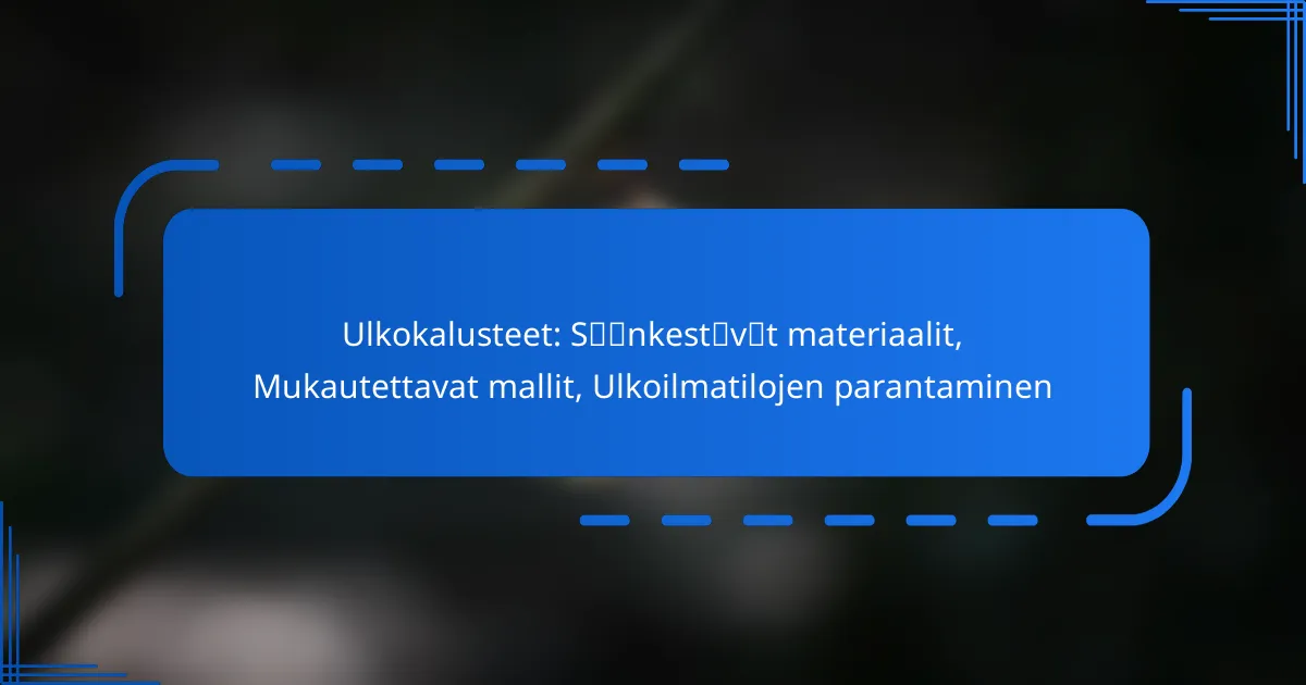 Ulkokalusteet ovat tärkeä osa ulkotilojen suunnittelua, ja niiden valinnassa kannattaa kiinnittää huomiota säänkestäviin materiaaleihin, kuten polypropyleeniin, alumiiniin ja komposiittiin. Mukautettavat mallit tarjoavat mahdollisuuden räätälöidä kalusteet juuri omaan käyttötarkoitukseen ja tyyliin sopiviksi. Hyvin suunnitellut ulkotilat eivät ainoastaan paranna esteettisyyttä, vaan myös lisäävät tilojen käyttöä ja nostavat kiinteistön arvoa.